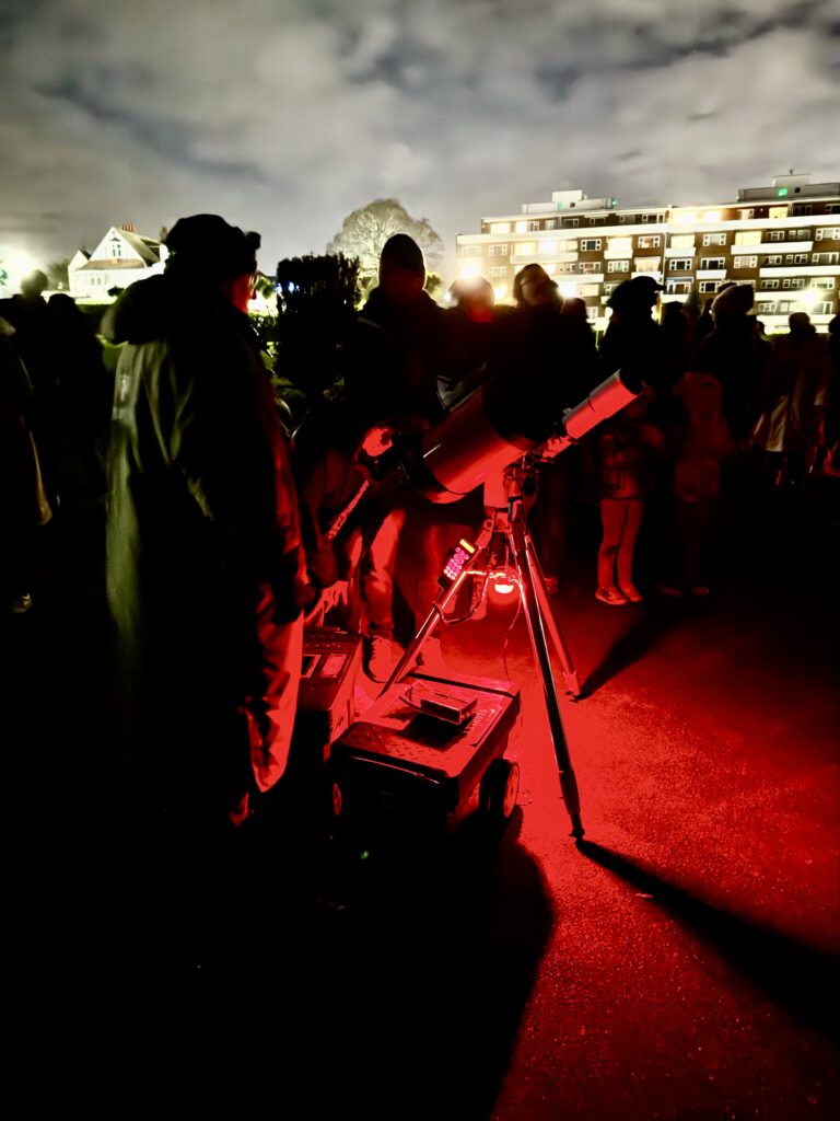 We had around 200 eager observers young and old, who saw the Moon close-up and the majority saw Jupiter, and its cloud bands and Galilean moons before it eventually clouded over. Lots of warming coffees and hot chocolates from Cadence Coffee. We were so busy with the telescopes that we didn’t have time to set up our travelling Powerpoint astronomy presentation! We had a 12in Dobsonian, 8in SCT, a couple of small refractors and a small Newtonian to look through – plus an imaging rig on a laptop and a Seestar S30 smart telescope.